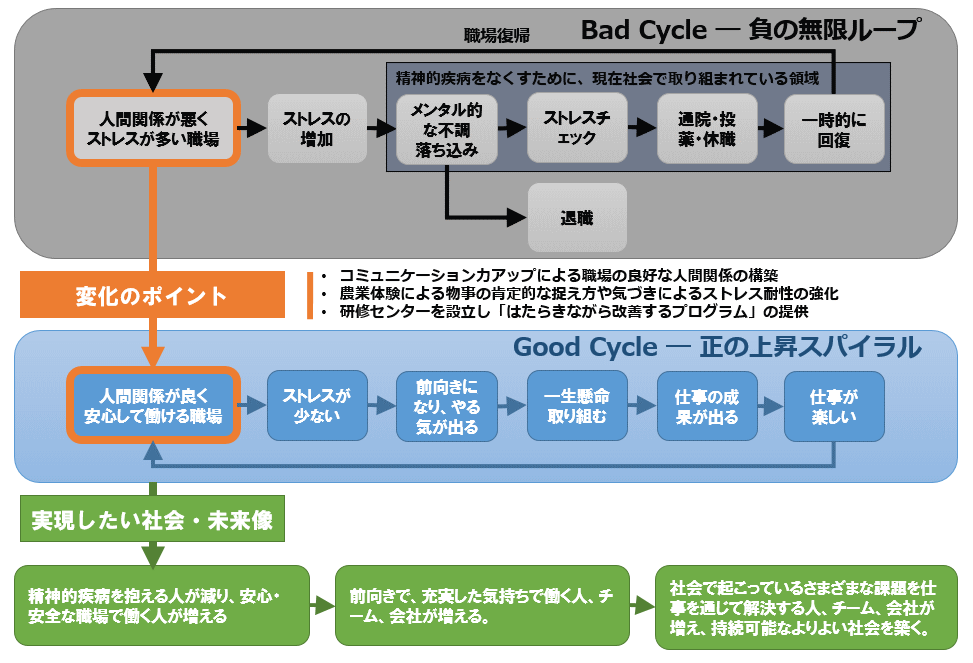 この図は、しごとのみらいの事業プランです。矢印の関連が、「で?」「すると?」でつながっているのがお分かりいただけるでしょうか。