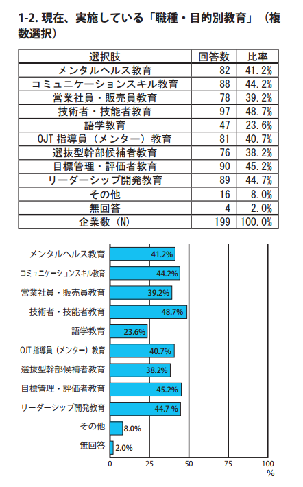 一般財団法人日本生涯学習総合研究所の「企業における人材育成」に関する実態調査によれば、現在、実施している「職種・目的別教育」の中で、回答した約半数の企業がコミュニケーションスキル研修を行っていることが分かります。
