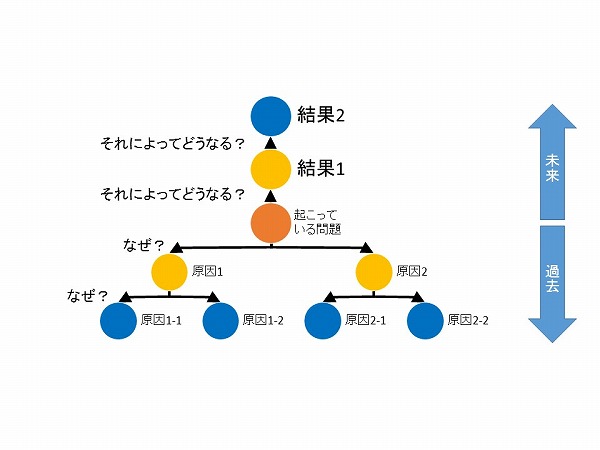 なぜなぜ分析は問題を「なぜ?なぜ?」と繰り返し問いかけて原因を深堀りする方法ですが、なぜなぜ分析に加えて「それによってどうなるのか?」を繰り返し問いかけて深堀りすると、未来を見据えた高い視点での問題解決に役立ちます。