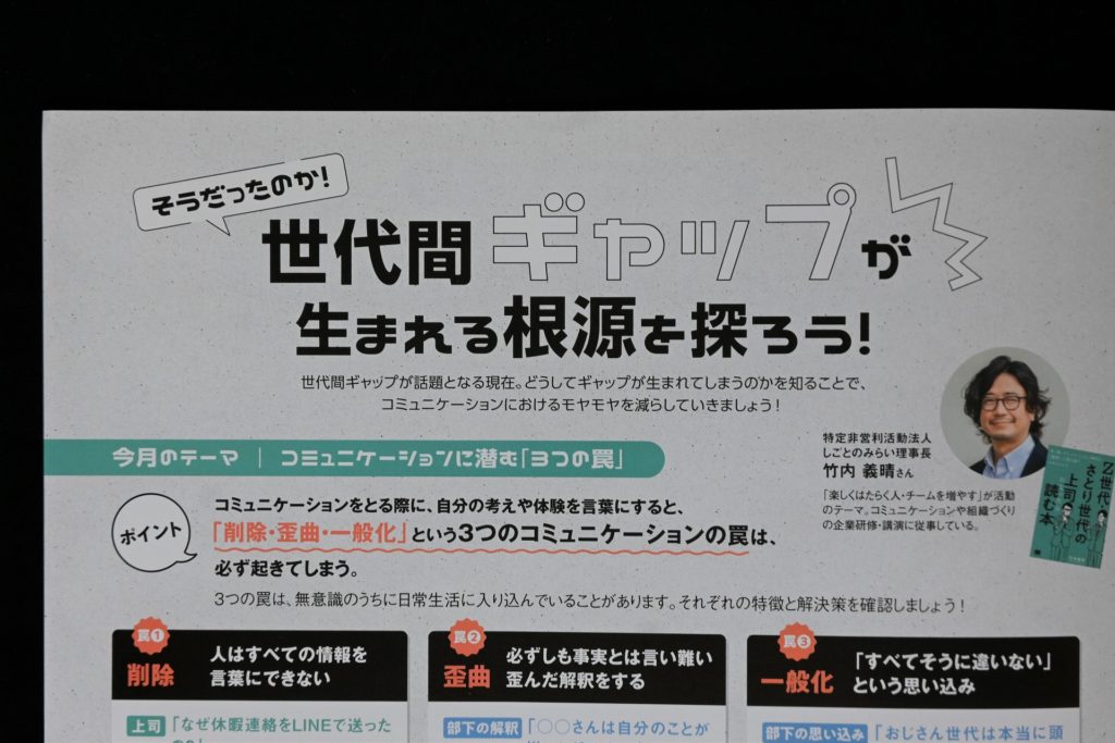 全トヨタ販売労働組合連合会発行の機関紙『HOLON』193号(2023年1月発行)に、しごとのみらい 理事長 竹内義晴が寄稿した記事「世代間ギャップが生まれる根源を探ろう~コミュニケーションに潜む「3つの罠」」が掲載されました。