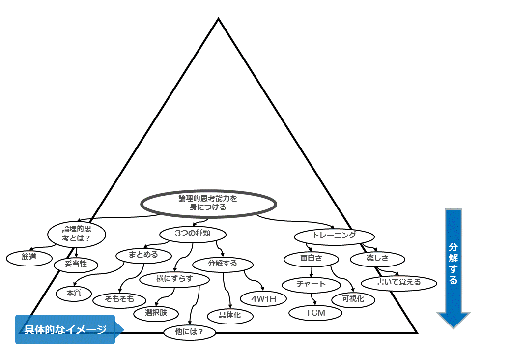 一つの物事を分解したら、分解した要素をさらに細かく出来ないかを考えます。そして、山の裾野が広がるように具体的にします。このように細かく分解することによって、「それがどのようなことなのか」が具体的になります。