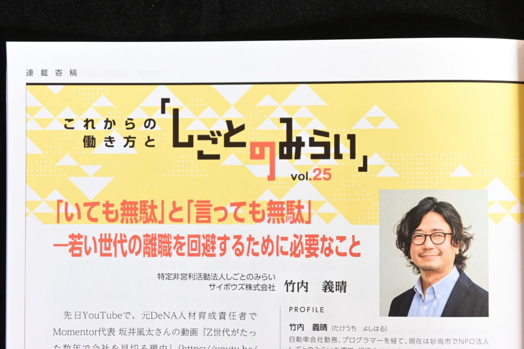 第四北越リサーチ&コンサルティング発行の機関紙『Monthly』2023年8月号に、しごとのみらい 理事長 竹内義晴が寄稿した記事「「いても無駄」と「言っても無駄」―若い世代の離職を回避するために必要なこと」が掲載されました。