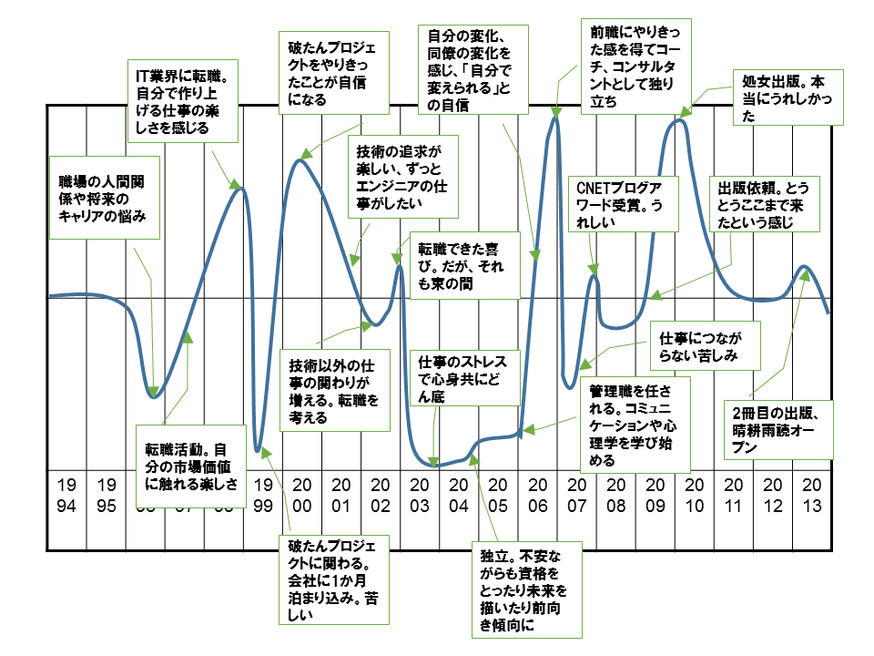 たとえば、これは筆者のレジリエンスチャートです。過去を振り返ることによって、さまざまな困難を乗り越えてきたことが分かるとともに、「きっと今回も乗り越えられる」という勇気が沸いてきます。