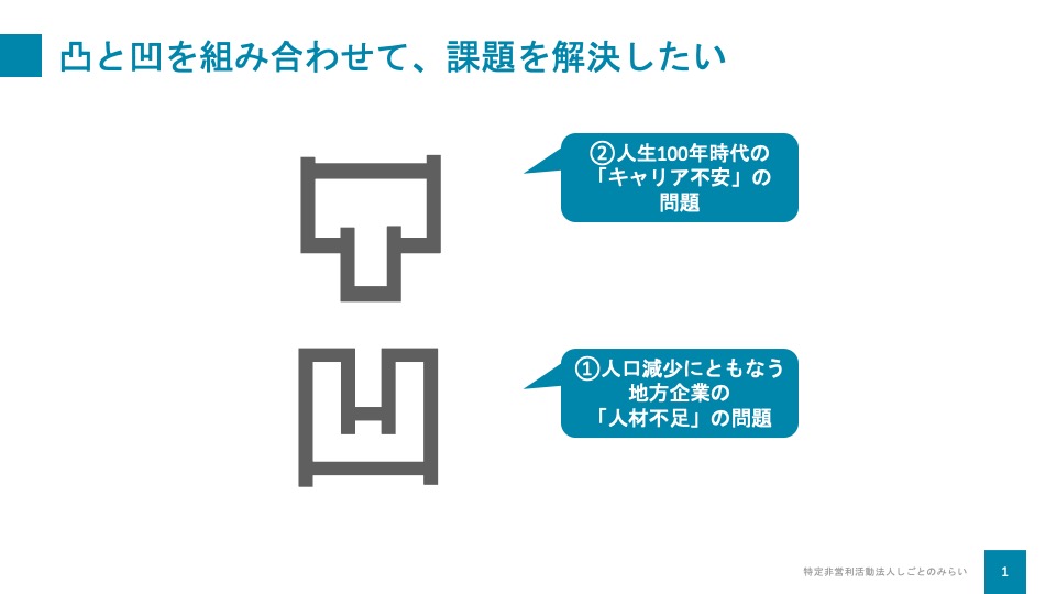 しごとのみらいでは、「企業の人材不足」という“凹”の部分と、「労働人口の大きな割合を占めるミドルシニア世代」という“凸”の部分を組み合わせることで、双方の課題を解決する仕組みづくりに取り組んでいます。