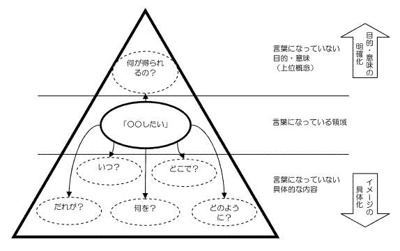 望ましい姿、抱えている問題を4W1Hや、どんなシーンで(視覚情報)、どんな声が聞こえて(聴覚情報)、どんな気持ちか(体の感覚)などの視点で、自分で考えを整理したいのなら自分自身に、相手がいるのなら相手に問いかけ、具体的に聞きだします。矢印を伸ばして書き出し、さらに必要があれば矢印を伸ばして書き出し、イメージを具体化します。