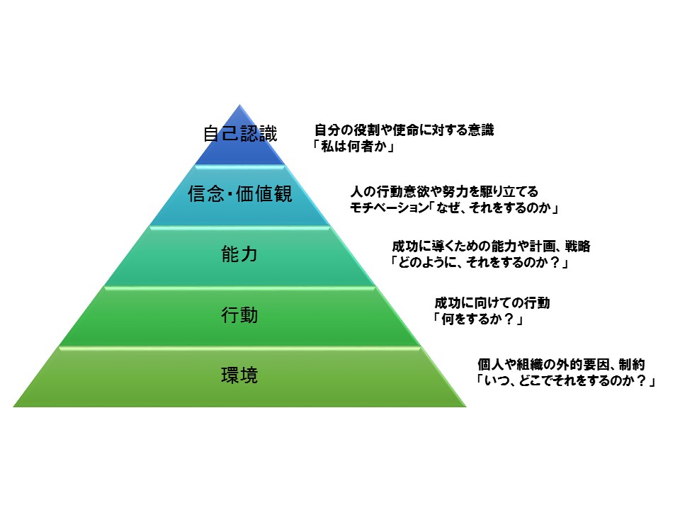 以下に示すのは、コミュニケーション心理学NLPの第一人者、ロバート・ディルツ氏が考案したニューロロジカル・レベルという人の意識モデルです。人は、「私はこういう人だ」という自己認識を元に、「なぜ、それをするのか」という信念・価値観を抱き、それを、実現するための能力を身に着け、そのために行動し、ある環境に身を置きます。